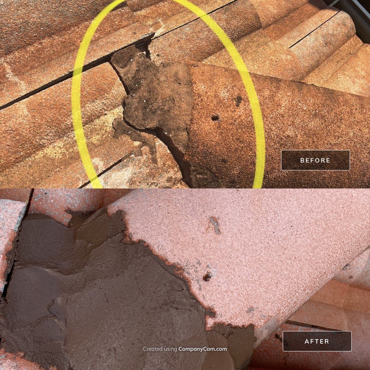 This restoration project at 75th Pl N involved addressing critical wear on a tile roof system to ensure long-term weather protection. Our inspection identified a severely degraded plumbing vent seal and cracked, failing mortar along the ridge transitions—two common entry points for water during Florida’s heavy rain season. We performed a precision repair by removing the porous, failing debris and applying new, professional-grade roofing mortar and weather-resistant sealants to create a seamless, watertight barrier around the vent and ridge caps. To finalize the maintenance, the entire roof underwent a soft-wash cleaning to remove organic accumulation, successfully restoring the tiles’ original vibrant tone and reinforcing the overall structural integrity of the roof.